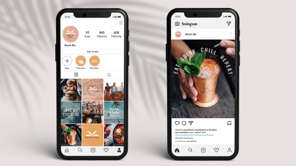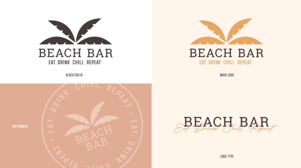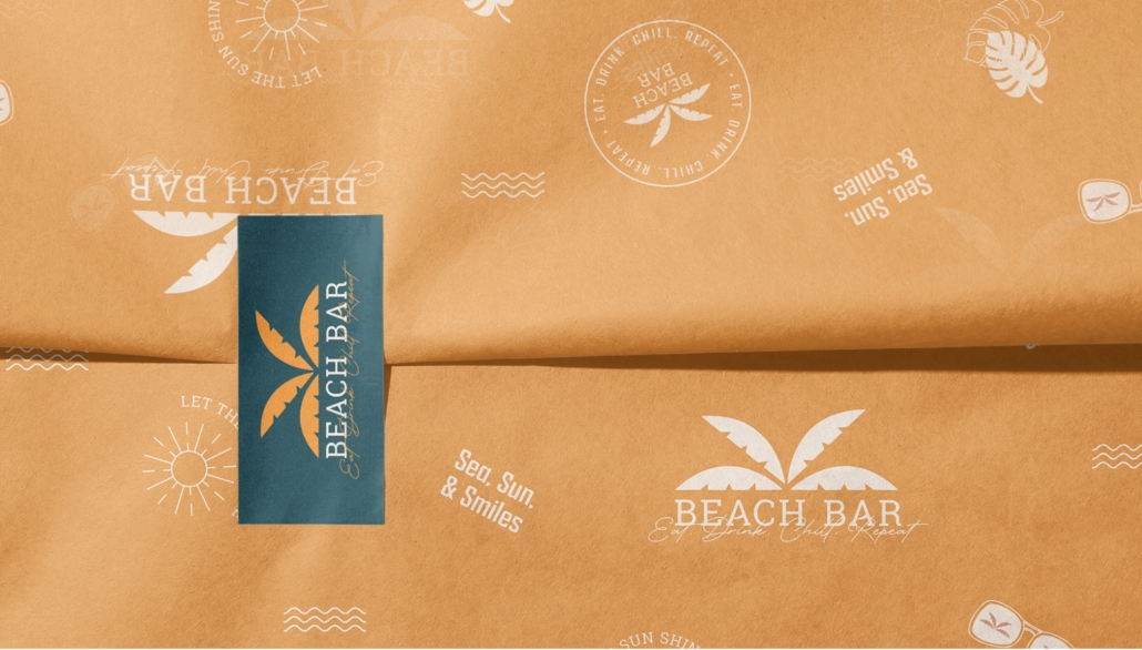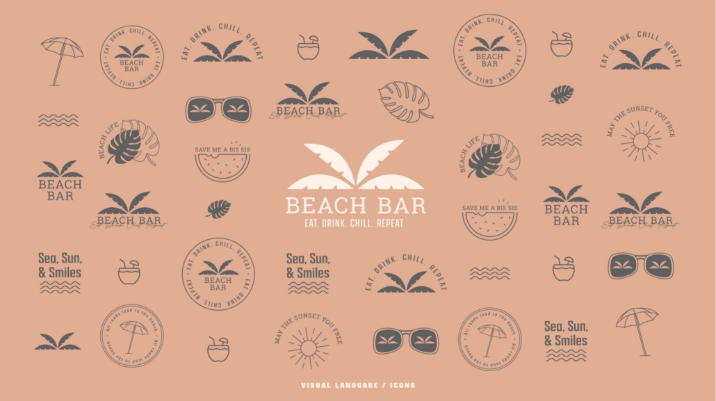 This comprehensive branding for “Beach Bar” demonstrates thoughtful design and consistency. The core logo, featuring stylized palm leaves creating a subtle horizon, is versatile and instantly recognizable. The chosen typography strikes a balance between modern and approachable, while the brand’s color scheme (a blend of terracotta, sand, and deep ocean blue) anchors it firmly in a beach setting. From merchandise to digital presence, the cohesive visual identity – including supporting icons like waves and suns – reinforces the brand’s commitment to a seamless and memorable beach bar experience.